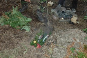One of the keys to survival, and it’s important you remember this, is if you find yourself stuck in the woods it’s very useful to have a glamorous assistant you can send to Tesco. Luckily for Instructor Pete his glamorous assistant returned right on cue for a demonstration on how to turn our new found flame in to dinner. Hot rocks were taken from a fire that had been set a good while earlier and placed in a hole dug previously to create a “hangi oven”. On top of this went some nice green foliage and then we added the contents of the emergency survival supermarket bag. Having gutted a trout, and invited Lyndsay to do the other which she did superbly, these were put in the oven alongside some vegetables (carrot, potato, swede) and some chunks of beef expertly taken from the plastic packaging they arrived in. In hindsight I’m quite glad we didn’t spend the afternoon preparing fresh caught squirrels but it would certainly have been an experience! The food was covered with more fresh leaves, buried and left for later while we worked up an appetite…