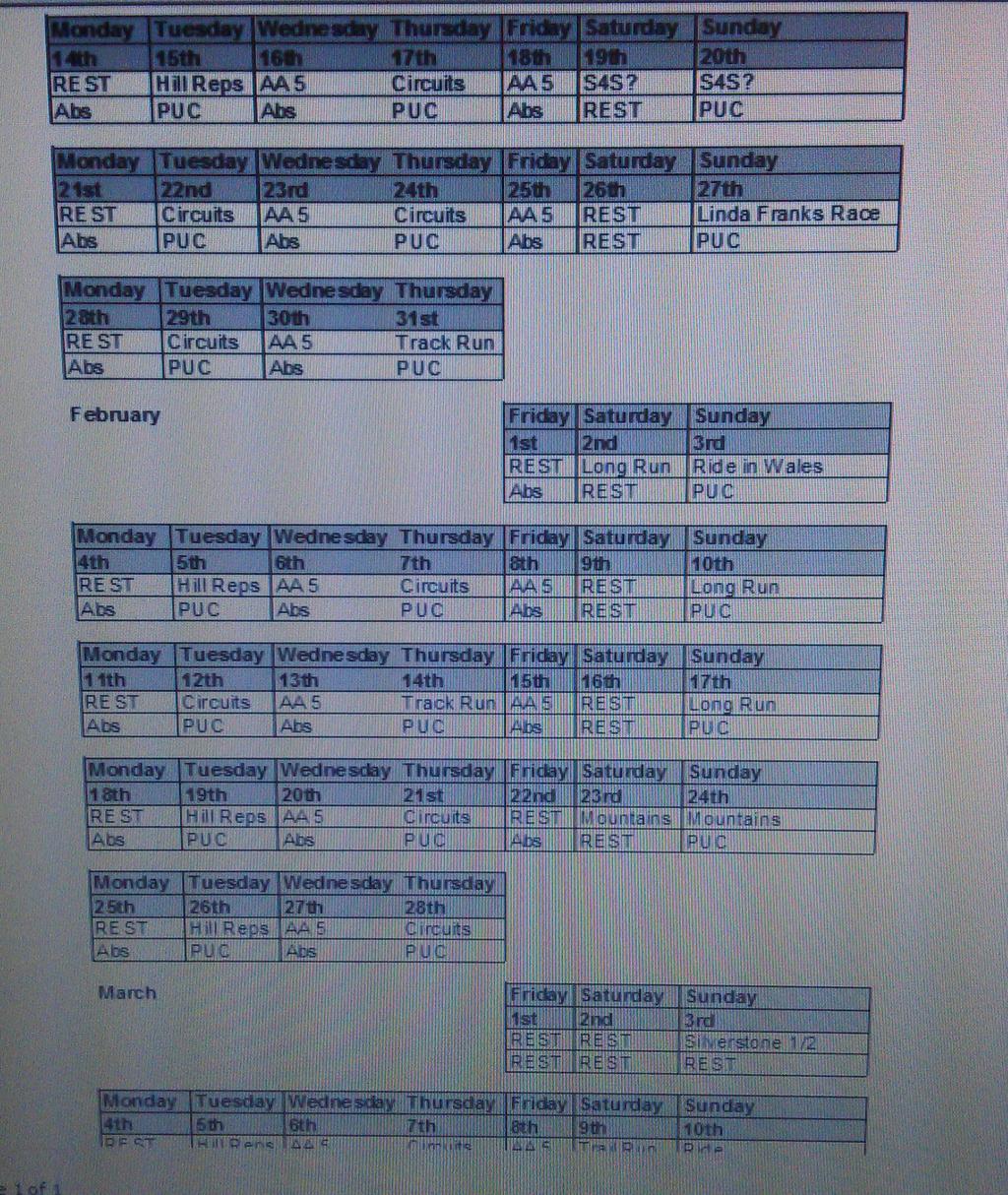 So, I’ve developed, written and printed my training schedule for the next 40 days. I started following it last week but the snow has obviously ruined everything, or at least that is my excuse. So, whether you’re interested or not, I will be reporting back weekly on how well I’ve stuck to my schedule in the hope that the public confession of any failings will make me think twice about ditching a run. If you see me making any more excuses over the next 40 days then please give me a verbal kick up the arse!