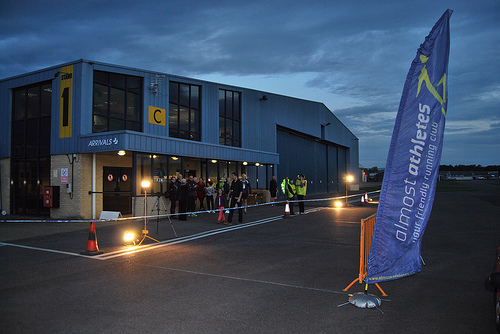 As the name suggests, it’s a 1 mile dash, but what makes this race special is that it took place on the runway of the airport with the landing lights etc on. It’s an incredible venue, with registration in the arrivals lounge as the sun goes down. There were 96 runners on the start line and plenty of support waiting at the finish for them.