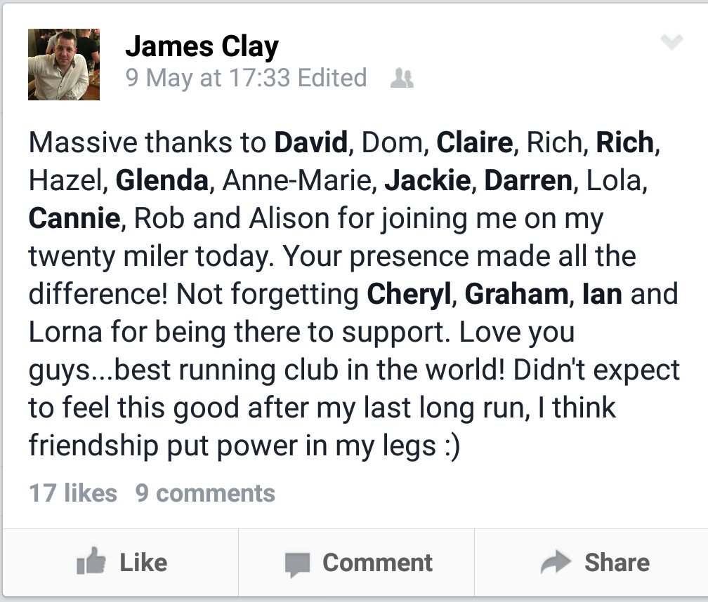 So it was that I set off at 10am on Saturday morning, in the company of Hazel and Dom (Almost Athlete club mates who had just done parkrun nearby) and with my mum keeping an eye on things at the start line. Over the first few miles quite a few friends popped by for some mileage, some returning from parkrun, others building it in to their own running plans for the morning. At one point I think there were 7 or 8 of us running together, which was a great start and made the first 6 miles fly by.